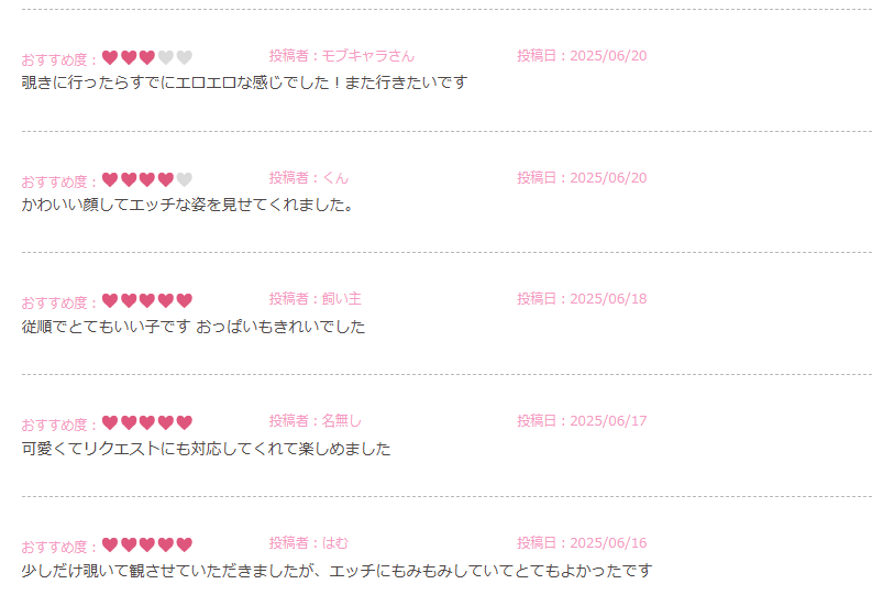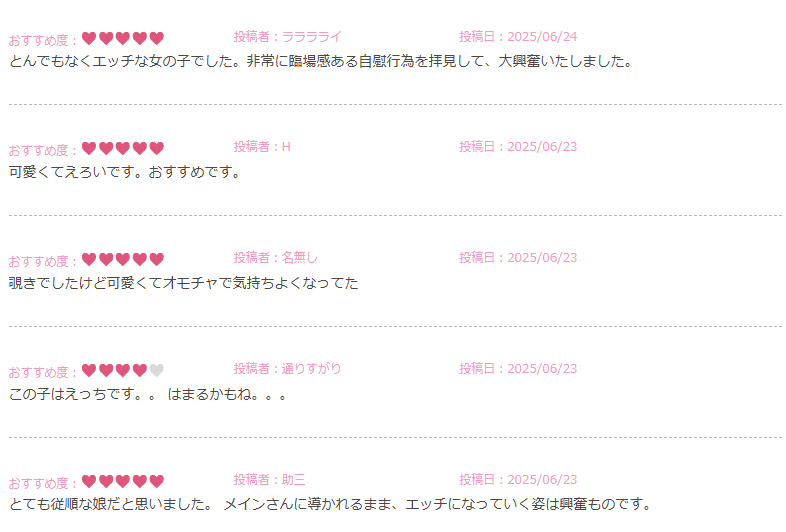 実際に女の子と接したユーザーの声には、どのようなプレイを楽しめたか記載されています。2ショットチャット前に見ておけば、期待した通りの反応をしてくれる子か判断可能です。