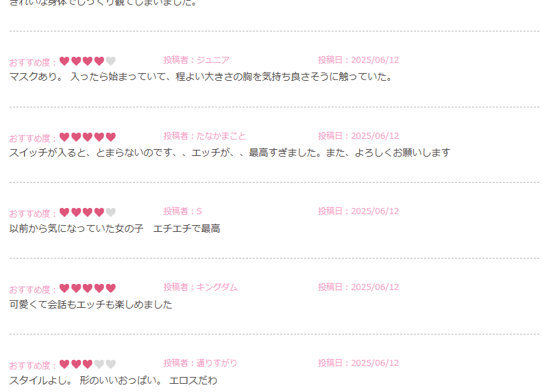 「従順な娘だった」「甘やかしながらいじめてくれるバランスが最高」など、性格やプレイスタイルのコメントがあればどのような女の子か容易に判断できます。