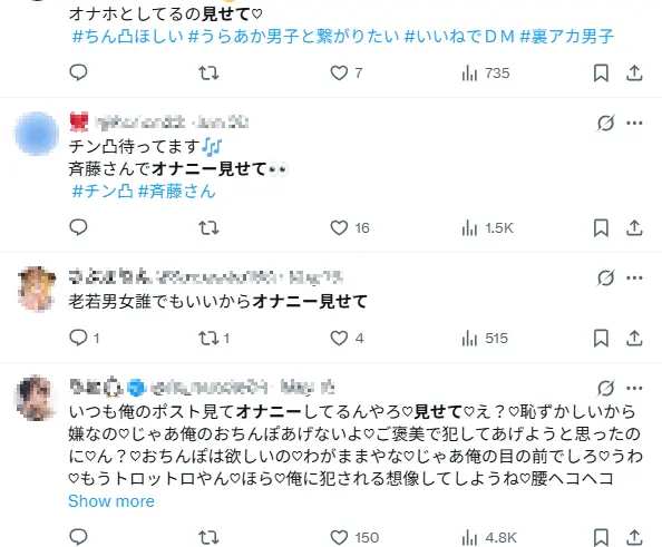SNSを利用している子の中にはエロい子もいるため、繋がればオナニーを見てくれます。ただし、「#オナニー 見せて」「#オナニー 見たい」などの投稿は業者ばかりで、素人の女性を見つけるのは難しいです。