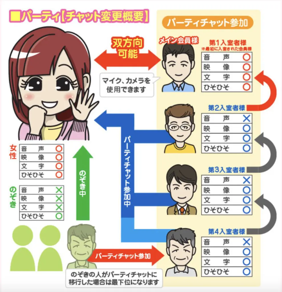 「ジュエルライブ」の魅力といえば、1人の女の子を複数人のユーザーで囲んでエロトークを楽しむ「パーティーチャット」の盛り上がり。
